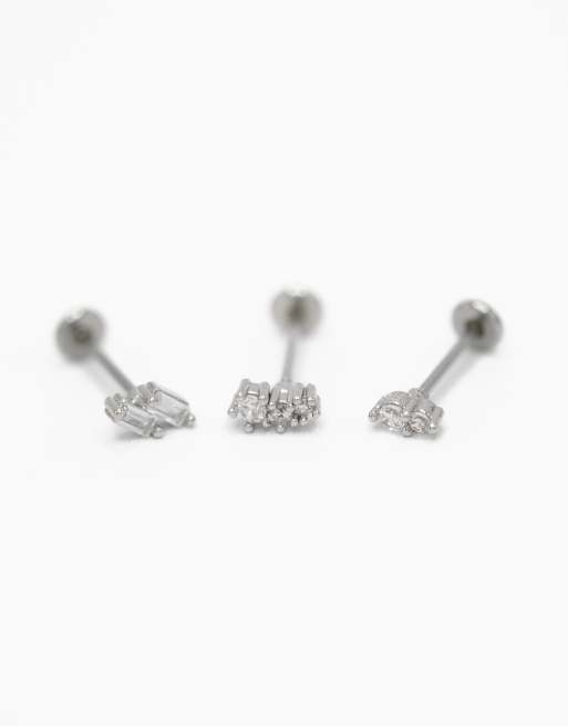 Lovisa – 3er-Pack silberfarbene Piercings aus Chirurgenstahl mit Zirkoniabesatz, doppeltem Baguette-Schliff und flacher Rückseite