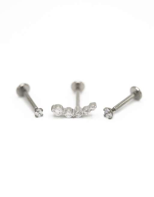 Lovisa – 3er-Pack silberfarbene Piercings aus Titan mit Zirkoniabesatz, Kugeldesign und flacher Rückseite
