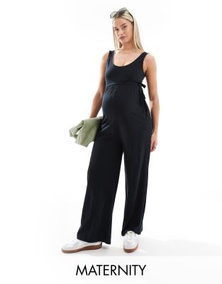 Mamalicious Maternity – Jersey-Jumpsuit in Schwarz mit weitem Bein und Bindegürtel, Umstandsmode