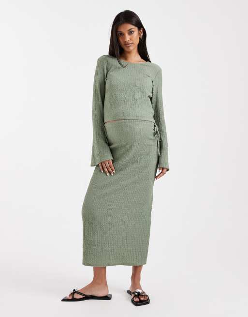 Mamalicious Maternity – Strukturiertes Set aus Jersey in Khaki-Grün mit Oberteil mit Glockenärmeln und Midirock