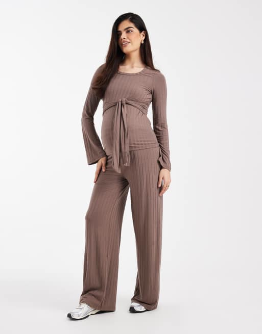 Mama.licious Maternity – Umstands-Set in Hellbraun mit geripptem, langärmligem Oberteil mit Bindedetail und Hose mit weitem Bein