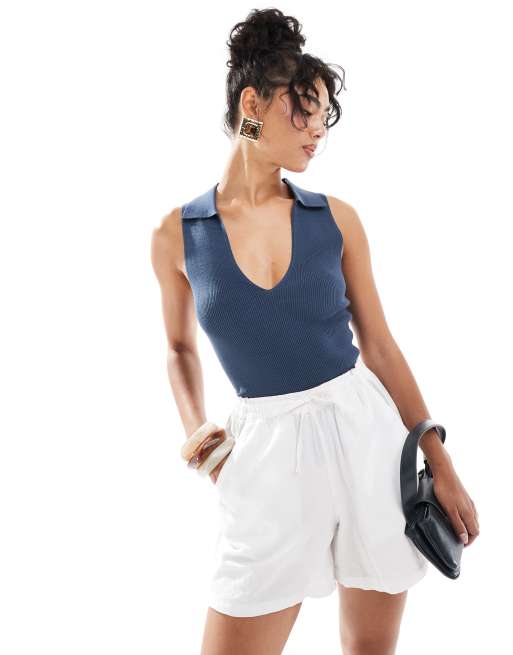 Mango – Ärmelloses Oberteil in Marineblau mit V-Ausschnitt
