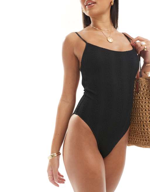 Mango – Badeanzug in Schwarz mit strukturierten Streifen