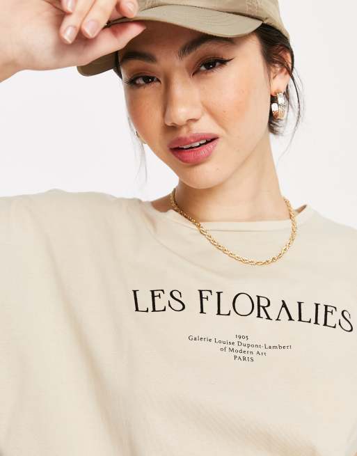 Mango – Baumwoll-T-Shirt in Beige mit „Les Florales“-Schriftzug - BEIGE