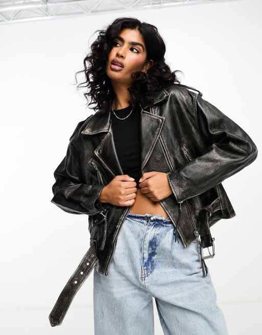 Mango – Capsule – Oversize-Lederjacke in verwaschenem Schwarz