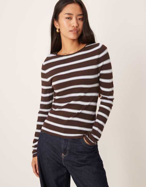 Mango – Feinstrick-Oberteil mit Streifen in Braun und Blau und Rundhalsausschnitt
