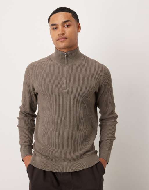 Mango – Gerippter Pullover aus Baumwollmix in Braun mit kurzem Reißverschluss