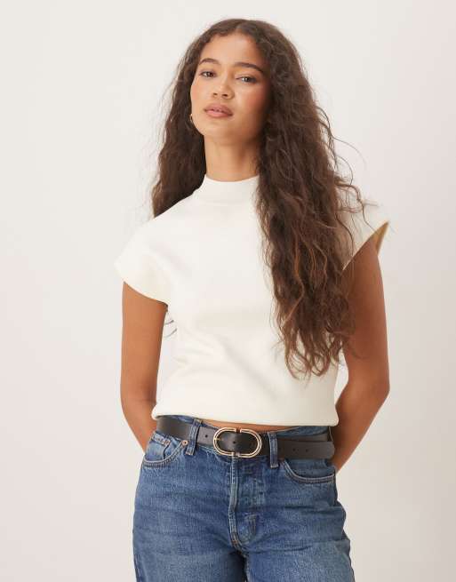 Mango – Hochgeschlossenes Oberteil aus Strickstoff in Creme mit Kappärmeln