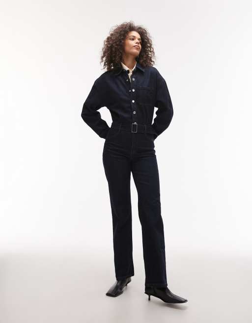 Mango – Jeans-Jumpsuit in Dunkelblau mit Gürtel