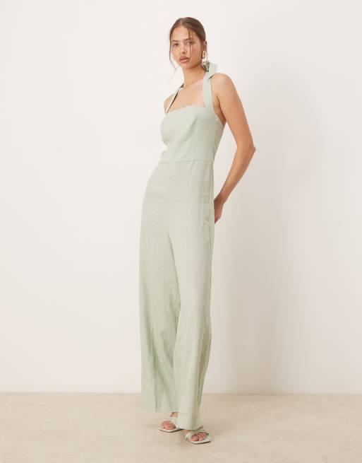 Mango – Jumpsuit in Salbeigrün mit eckigem Neckholder und Bundfalten