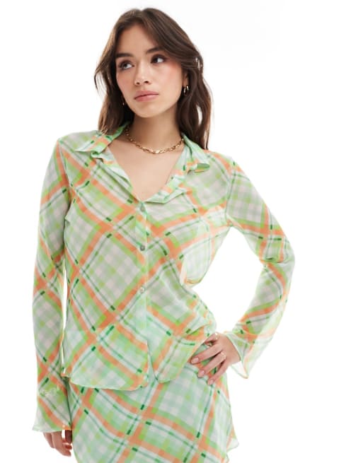 Mango – Kariertes Kombi-Set aus Hemdbluse und Rock in Orange und Grün