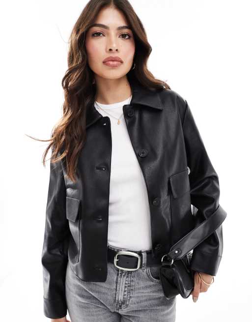 Mango – Kastige Bikerjacke aus schwarzem Kunstleder