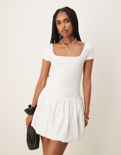 Mango – Kurzärmliges Minikleid in Weiß mit eckigem Ausschnitt und Ballonsaum