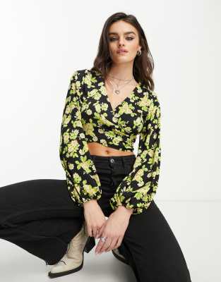 Mango – Langärmlige Bluse mit gewickelter Vorderseite und gelbem Blumenmuster