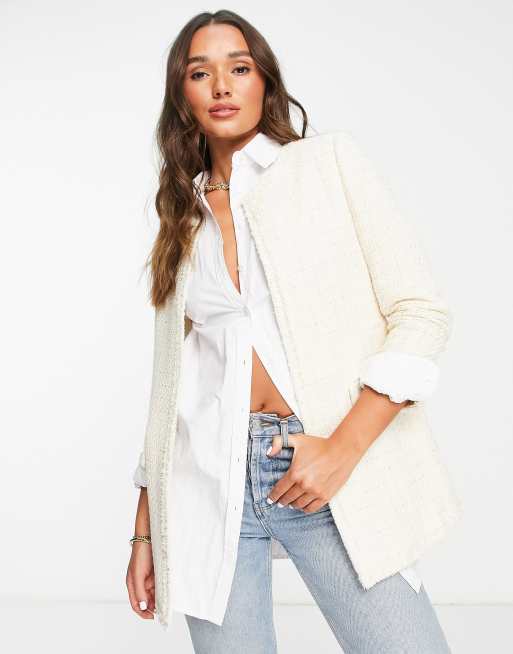 Mango – Lange Tweed-Jacke in Creme