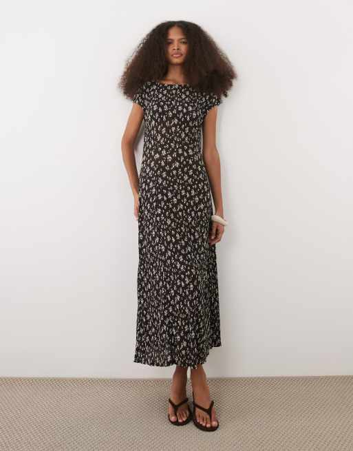 Mango – Midikleid in Braun geblümt mit Flügelärmeln und Knitterstruktur