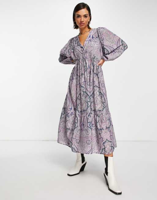 Mango – Midikleid in Flieder mit V-Ausschnitt und Blumenmuster