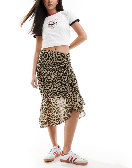 Mango – Midirock in Braun mit Leopardenmuster und asymmetrischem Saum