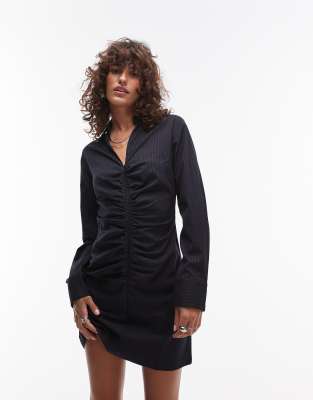 Mango – Minikleid in Marineblau mit seitlicher Raffung, Reißverschluss und Nadelstreifen