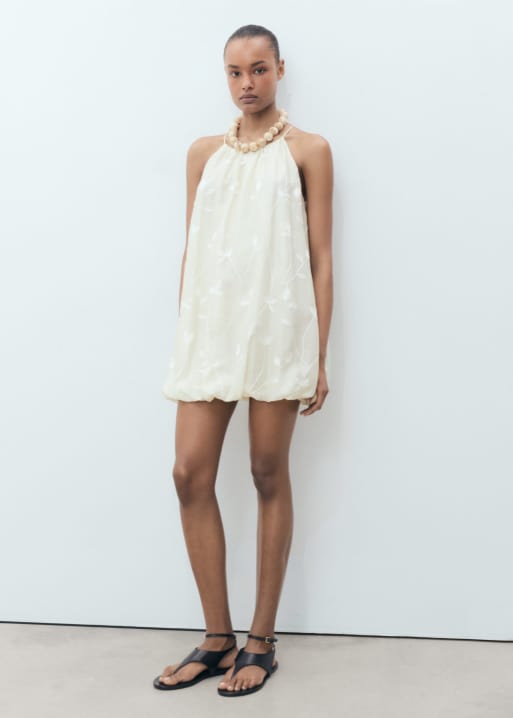 Mango – Neckholder-Kleid in Cremeweiß mit Ballonsaum und Blumenstickerei