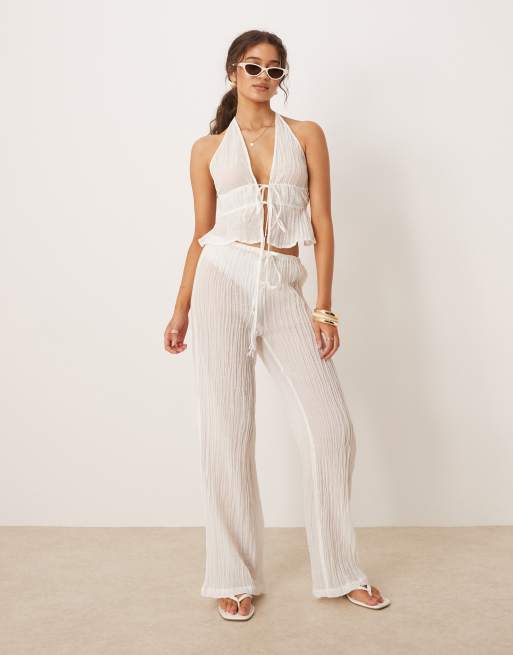 Mango – Ramie – Hose in Weiß mit Knitterstruktur und Taillenbindung, Kombiteil