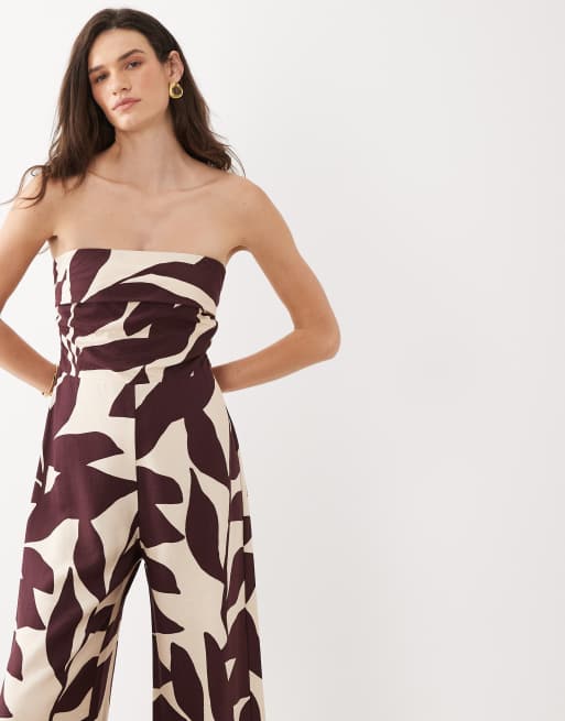 Mango – Schulterfreier Jumpsuit in Cremeweiß mit braunem Blattmuster