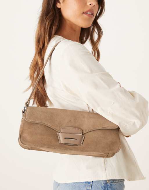Mango – Schultertasche aus Leder in Kastanienbraun mit Kontrastnähten