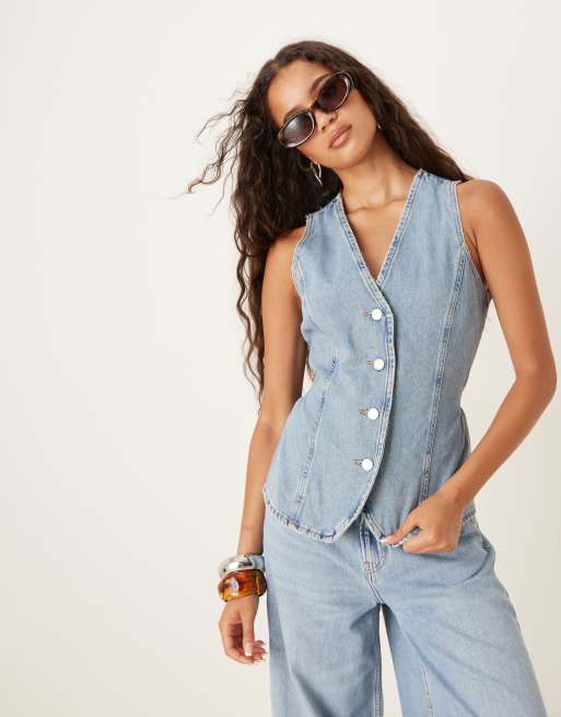 Mango – Set mit Jeansweste mit Ziernaht und weiter Jeans in verwaschenem Hellblau