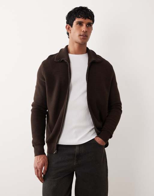 Mango – Strukturierte Strickjacke aus 100% Baumwolle in Schokobraun mit durchgehendem Reißverschluss