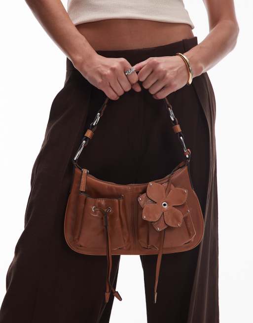 Mango – Umhängetasche aus Leder in Braun mit Blumenanhängern