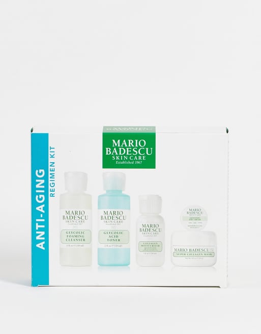 - 1 x Mario Badescu – Schaumreiniger mit Glykolsäure: 59 ml1 x Mario Badescu – Gesichtswasser mit Glykolsäure, 59 ml1 x Mario Badescu Kollagen-Feuchtikeitscreme mit LSF 15: 29 ml1 x Mario Badescu Super-Kollagen-Maske: 14 g1 x Mario Badescu Glykolische Augencreme: Probiergröße