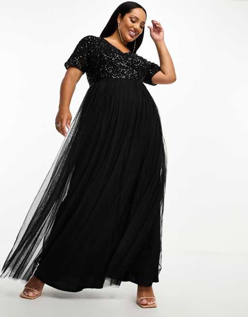 Maya Plus – Bridesmaid – Kurzärmliges Maxikleid aus Tüll in Schwarz mit zarten, farblich abgestimmten Pailletten