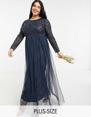 Maya Plus – Langärmliges Brautjungfern-Maxikleid in Navy mit Tüllrock und Paillettenverzierung