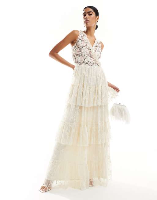 Maya – Verziertes, gestuftes Maxikleid in Cremeweiß
