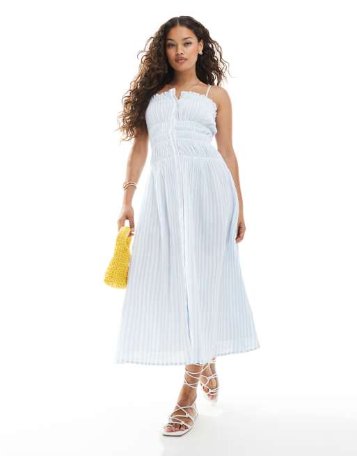 Miss Selfridge Petite – Maxikleid mit blauen Streifen, gesmoktem Oberteil und durchgehender Knopfleiste