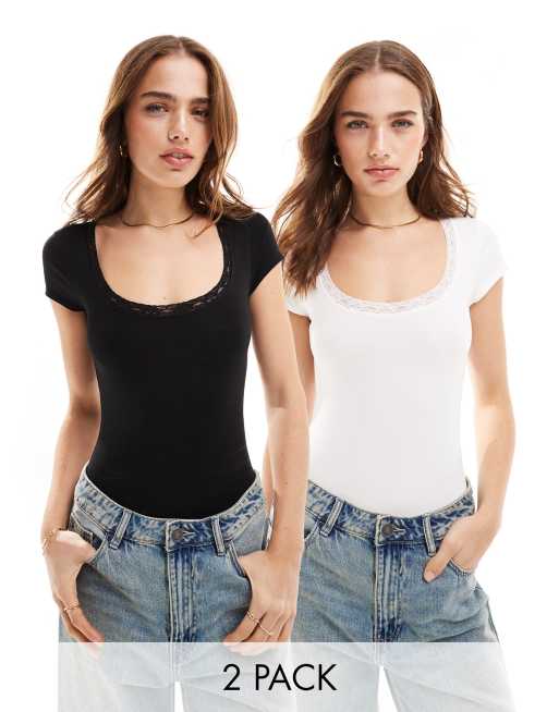 Miss Selfridge – 2er-Pack Bodys in Schwarz und Elfenbein mit Spitzenbesatz und U-Ausschnitt