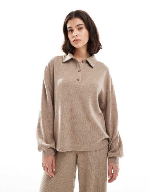 Miss Selfridge – Angerauter Pullover in Kamelbraun mit Kragen, Kombiteil