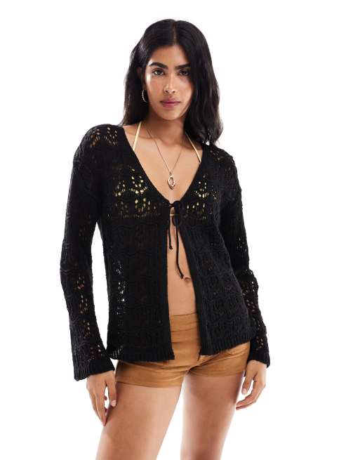 Miss Selfridge – Boho-Strickjacke in Schwarz mit gebundener Vorderseite