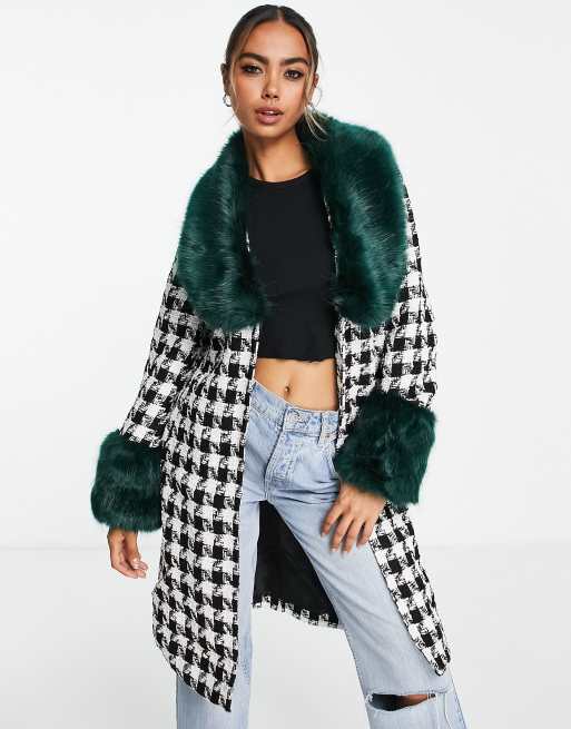 Miss Selfridge – Bouclé-Wickelmantel mit Kunstpelzkragen, Bündchen und Karomuster in Schwarzweiß