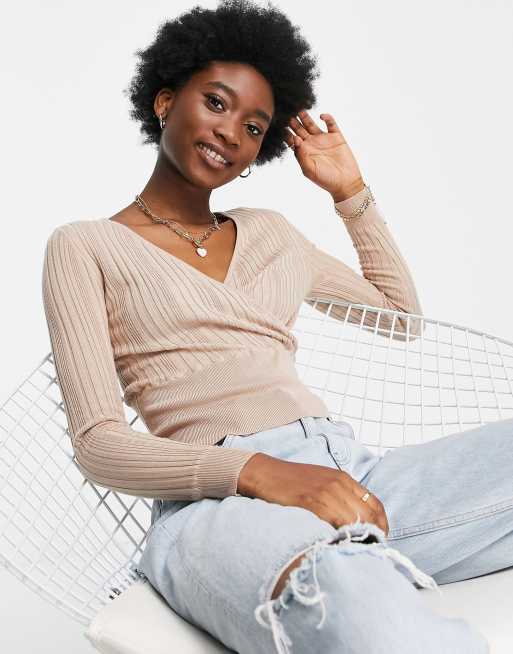 Miss Selfridge – Breit gerippter Strickpullover in Camel mit Wickeldesign