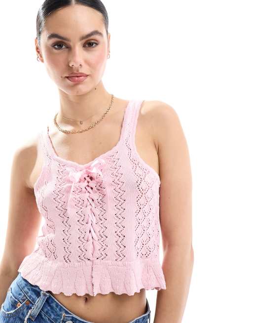 Miss Selfridge – Camisole-Oberteil aus Häkelware in Zartrosa mit kontrastierender Schnürung und Schleife aus Satin