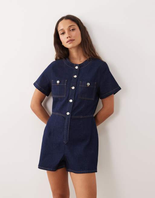 Miss Selfridge – Durchgeknöpfter Jeans-Playsuit in indigoblauer Waschung