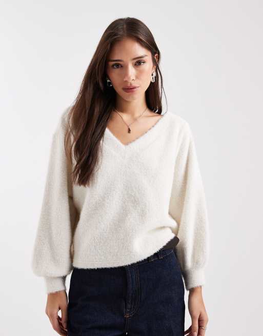 Miss Selfridge – Flauschiger, schulterfreier Pullover in Cremeweiß mit lockerem Schnitt
