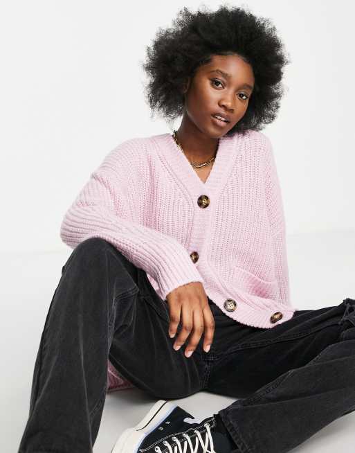 Miss Selfridge – Gerippte, lange Strickjacke mit Taschen in Flieder