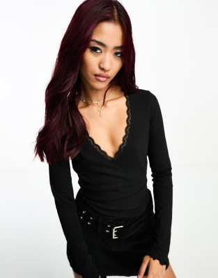 Miss Selfridge – Geripptes Wickeloberteil in Schwarz mit Spitzenborte