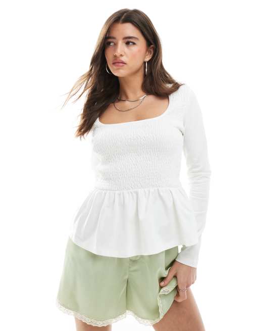 Miss Selfridge – Gesmoktes Schößchenoberteil aus Jersey in Ecru