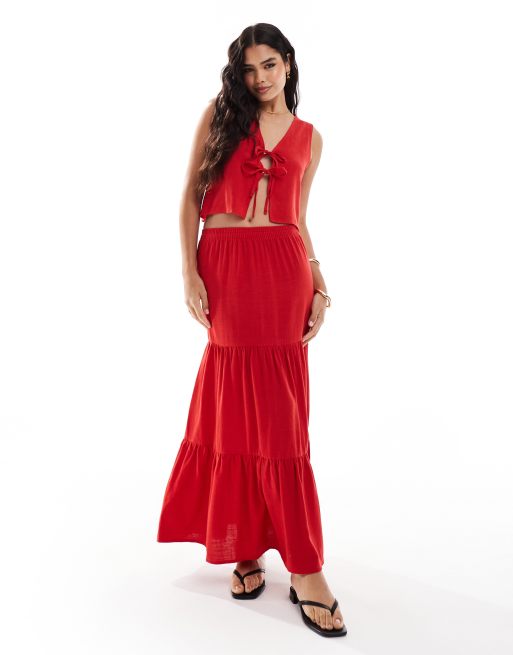 Miss Selfridge – Gestufter Maxirock aus Leinen in Rot