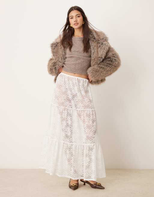 Miss Selfridge – Gestufter Maxirock aus Spitze in Cremeweiß
