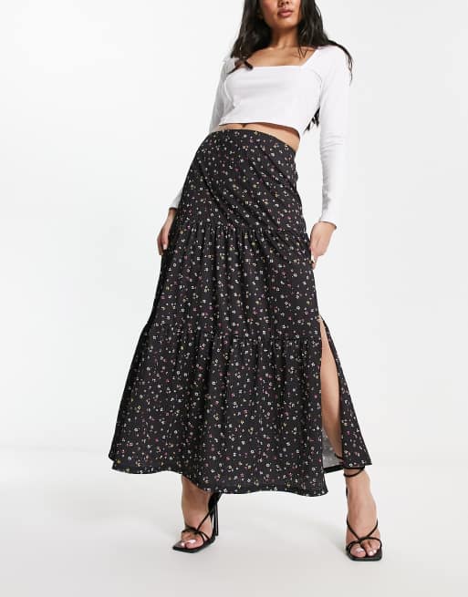 Miss Selfridge – Gestufter Maxirock in Schwarz mit Blümchenmuster und seitlichem Schlitz