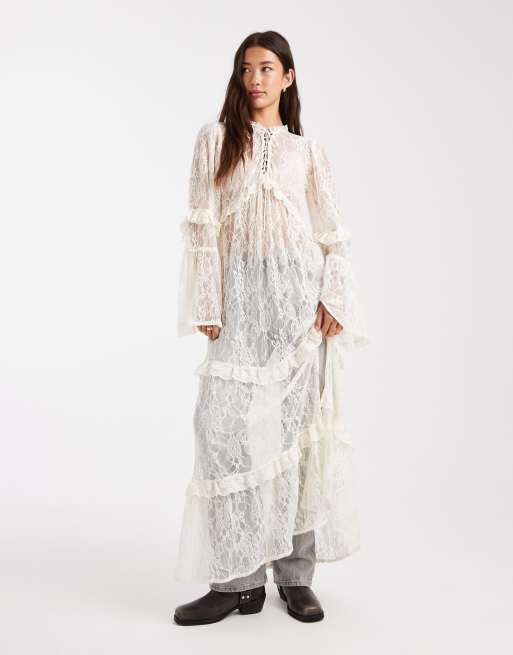 Miss Selfridge – Gestuftes Spitzen-Maxikleid in Ecru
